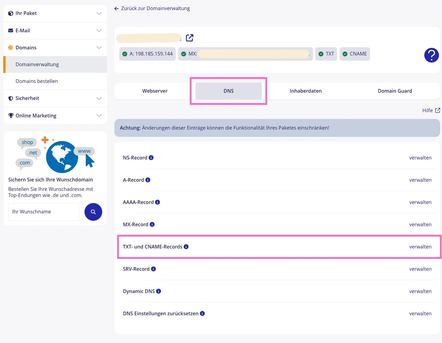Dann gibst du deine Domain (z. B. www.deinname.de) ein und klickst im nächsten Schritt auf „Domain verbinden“.